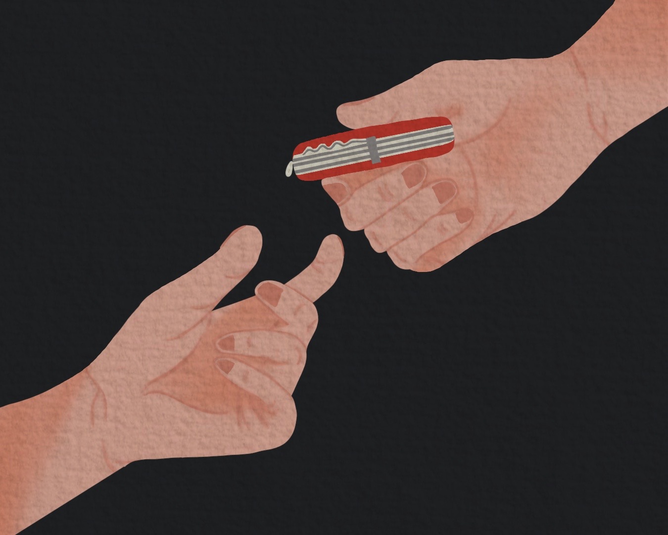 Un hombre con una navaja Victorinox en su mano, pensando qué podía hacer para no perderla. Las restricciones en los aeropuertos después de los atentados a las Torres Gemelas hacían imposible llevarla en su viaje. Eran nuevas dichas restricciones y todos se estaban recién familiarizando con ellas. Este objeto tenía un valor sentimental para él, había pertenecido a su padre quien se la había regalado, así que sentía mucho pesar por el hecho de perderla y esto le tenía pensativo, buscando alguna solución. Viajaría por una semana y volvería, pero ¿dónde dejarla? ¿qué seguridad tendría de recuperarla? Tenía poco tiempo. Finalmente, se acercó a alguien, le pareció una persona que podría darle alguna información. La conversación fue algo así: